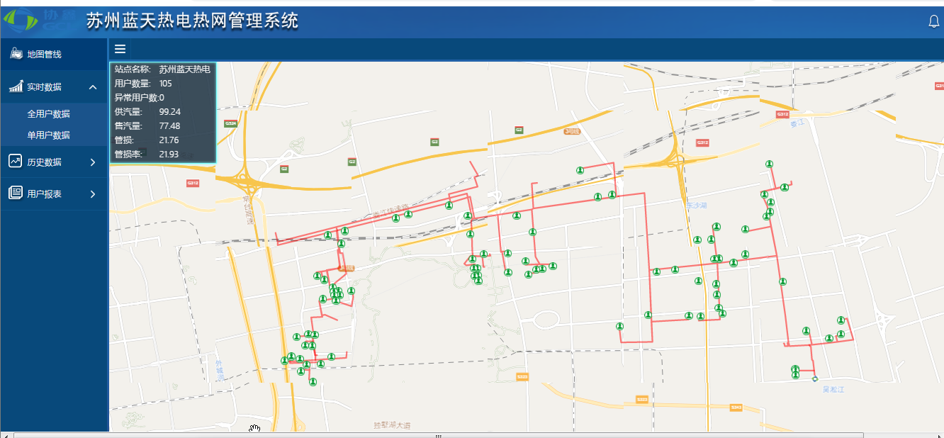 苏州蓝天是一家采用清洁能源天然气为燃料的大型热电联产混合所有制企业。该公司热网系统由上海多路公司承办于2005年并于当年投入使用,目前热用户已达到近100家热用户,2019年热网系统换代更新为由我公司基于Java平台采用B/S结构自主开发的系统,该系统兼容多种GPRS_DTU与流量积算仪仪表协议以及第三方系统接口功能(DCS、MIS、SIS等),同时支持移动终端访问。