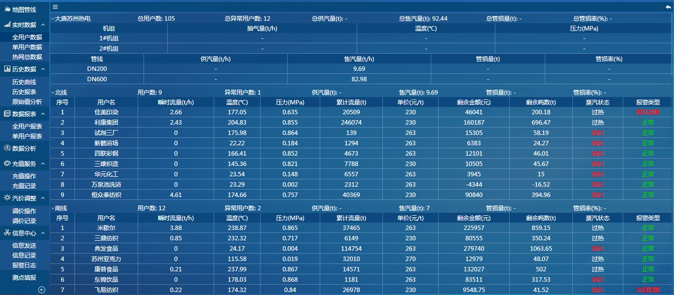 目前系统已开发有8大一级功能模块(地图管线、实时数据、历史数据、数据报表、数据分析、充值服务、汽价调整、信息中心)17个二级功能模块(热网总数据、全用户数据、单用户数据、历史曲线、历史报表、原始值分析、全用户报表、单用户报表、充值操作、充值记录、调价操作、调价记录、信息发送、信息记录、报警日志、测点填报、质量报告)